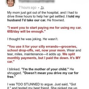 I was heading out to visit my mom after her stroke and asked to borrow my husband’s car. His response shook me: “Sure—$65 a day!” I was…