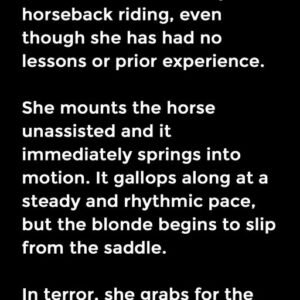 A blonde decides to try horseback riding, even though she has had no lessons or prior experience. She mounts the horse unassisted and it immediately springs into…