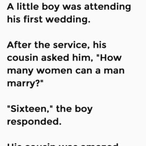 A little boy was attending his first wedding. After the service, his cousin asked him, “How many women can a man marry?” “Sixteen,” the boy responded. His…