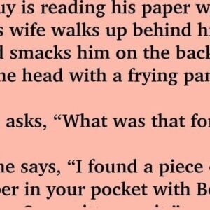 A guy is reading his paper when his wife walks up behind him and smacks him on the back of the head with a frying pan. He…