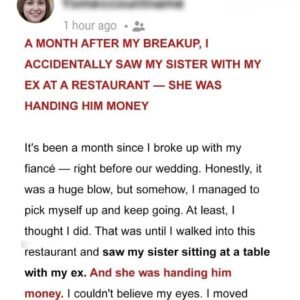 A month after my breakup, I was finally moving on when I stumbled upon my sister handing money to my ex-fiancé, the man who shattered my heart….