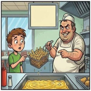 A boy reads a restaurant sign that advertised fat-free free French fries. “Sounds great!” said the health-conscious boy, as he ordered some. He watched as the cook…