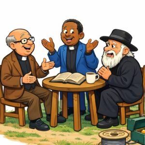 Three preachers sat discussing the best positions for prayer, while a telephone repairman worked nearby. “Kneeling is definitely best,” claimed one. “No,” another contended. “I get the…