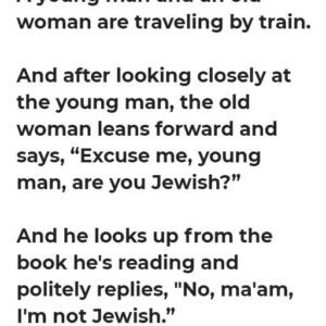A young man and an old woman are traveling by train. And after looking closely at the young man, the old woman leans forward and says, “Excuse…