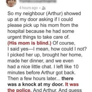 I learned the hard way that kindness can backfire. When I agreed to help my neighbor, Arthur, by picking up his blind mother, Maria, from the hospital,…