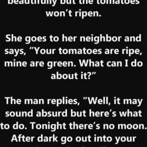 A woman’s garden is growing beautifully but the tomatoes won’t ripen. She goes to her neighbor and says, ”Your tomatoes are ripe, mine are green. What can…