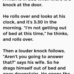 A man is in bed when there is a knock at the door. He rolls over and looks at his clock, and it’s 3:30 in the morning….
