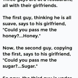 Three guys are at a restaurant, all with their girlfriends. The first guy, thinking he is all suave, says to his girlfriend, “Could you pass me the…