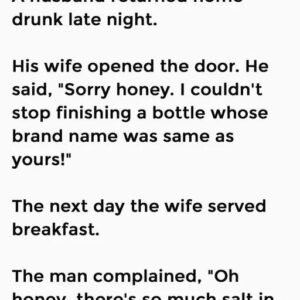 A husband returned home drunk late night. His wife opened the door. He said, “Sorry honey. I couldn’t stop finishing a bottle whose brand name was same…