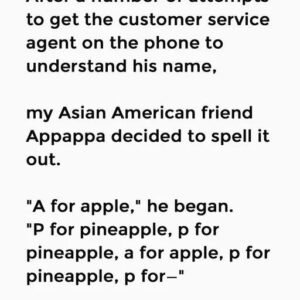 After a number of attempts to get the customer service agent on the phone to understand his name, my Asian American friend Appappa decided to spell it…