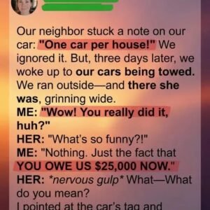 The note appeared on our windshield on a quiet Tuesday morning, written in bold marker: “One car per house!” It was taped neatly under the wiper, impossible…