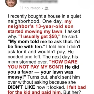 Homeownership felt like a dream—until my neighbor decided my lawn was her business. One afternoon, I came home to find her son mowing my yard without permission….