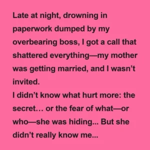 Late at night, drowning in paperwork dumped by my overbearing boss, I got a call that shattered everything—my mother was getting married, and I wasn’t invited. I…