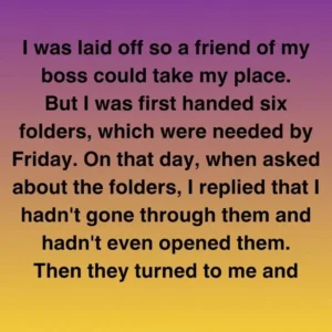 I was laid off so a friend of my boss could take my place. But I was first handed six folders, which were needed by Friday. On…