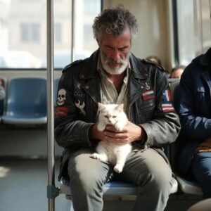 The biker sitting across from me on the subway was crying. Not just tearing up—full-on sobbing into a tiny orange and white kitten pressed against his chest….