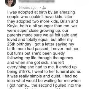When I turned 25, a lawyer’s letter revealed my birth mother, Alina, had passed away and left me her entire estate worth $187,000. I hoped my adoptive…