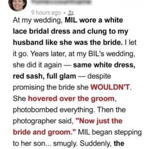 At my wedding, my mother-in-law, Linda, showed up late wearing a full-length white lace gown and stayed glued to my groom like she was the bride. It…