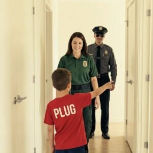 The room was dimly lit by a small nightlight, casting soft shadows on the walls. The officers’ footsteps were the only sound as they approached the bed…