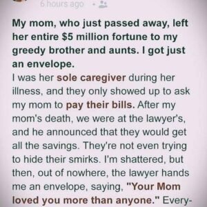 My mom, who just passed away, left her entire $5 million fortune to my greedy brother and aunts. I got just an envelope. I had been her…
